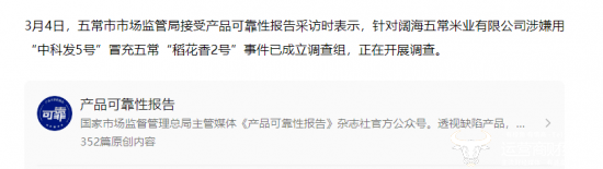 不过值得注意的是,据国家市场监督管理总局主管媒体《产品可靠性报告》杂志社官方公众号显示,在3月4日,五常市市场监管局接受产品可靠性报告采访时表示,针对阔海五常米业有限公司涉嫌用“中科发5号”冒充五常“稻花香2号”事件已成立调查组,正在开展调查。