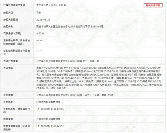 据行政处罚书内容显示,北京二锅头酒业股份有限公司于2020年5月10日生产1700瓶“永丰二锅头酒”(酒精度42%vol),同年5月15日将上述1692瓶“永丰二锅头酒”销售给陕西省宝鸡市秦兴商贸有限公司。经陕西省市场监督管理局抽样检验和复检,该批次“永丰二锅头酒”酒精度项目不合格。