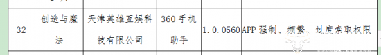 其中,由天津英雄互娱科技有限公司开发的《创造与魔法》存在APP(1.0.0560版本)强制、频繁、过度索取权限的行为。