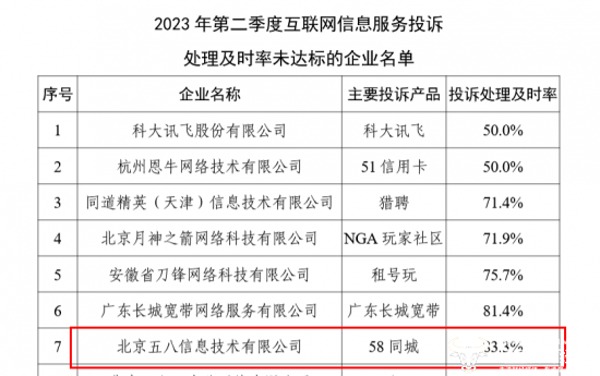 然而,58同城似乎并未放在心上。因为在工信部公布的第二季度电信服务质量的通告中,58同城再次出现在投诉处理及时率不达标的企业名单上,投诉处理及时率83.3%,仍未合格。
