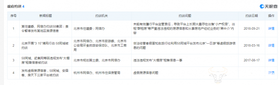 就天眼查显示,58同城被政府约谈就有四次,2018年3月就“非法经营者假冒知名旅行社利用58同城平台发布虚假旅游信息”被北京市网 信 办、北京市旅游委等部门联合约谈;后又在9月份因平台存在大量违法违规房源等被北京市住建委、网 信办约谈。