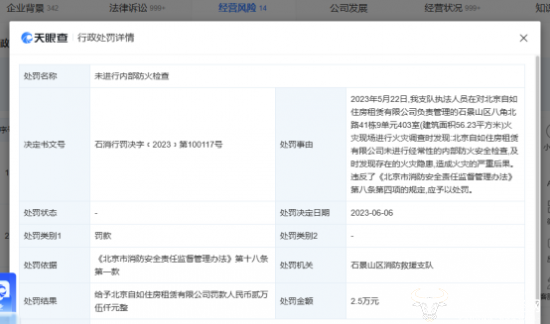 根据相关规定,2023年6月份,石景山区消防救援支队给予北京自如罚款2.5万元的行政处罚。