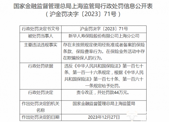 接着仅仅隔了一天,新华人寿保险股份有限公司上海分公司同样因在保险业务活动中存在欺骗投保人的行为遭罚,同时上海分公司还存在未按照规定使用经批准或者备案的保险条款、保险费率行为,被上海监管局责令改正,并罚款44万元。
