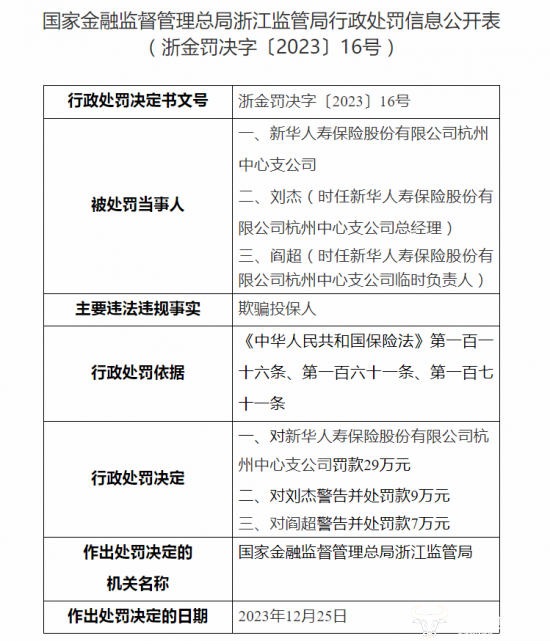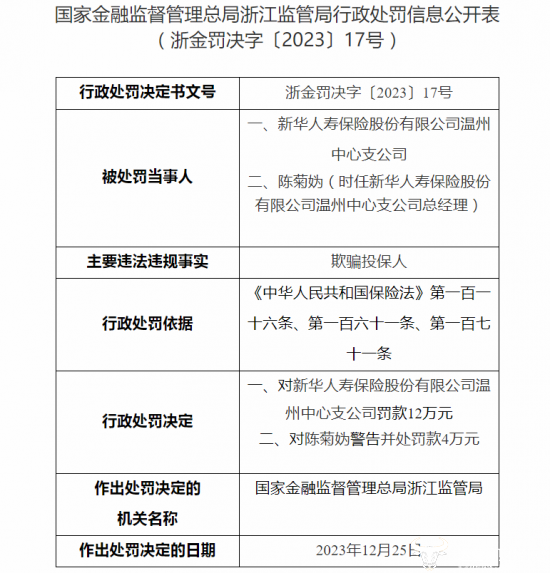 2023年12月25日,国家金融监督管理总局浙江监管局先后公布两则行政处罚(浙金罚决字〔2023〕16、17号),指向新华人寿保险股份有限公司杭州、温州中心支公司存在欺骗投保人的违法违规行为,分别被浙江监管局罚款29万元、12万元。