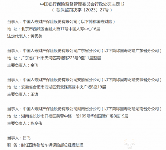 2023年5月25日,银保监会发布行政处罚决定书(银保监罚决字〔2023〕27号),文件显示,中国人寿财产保险股份有限公司因存在车险财务数据不真实的违法违规行为,被银保监会罚款50万元。