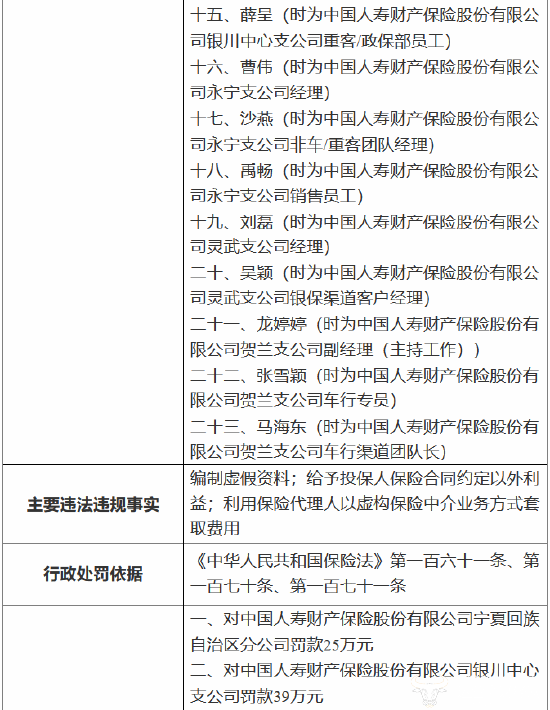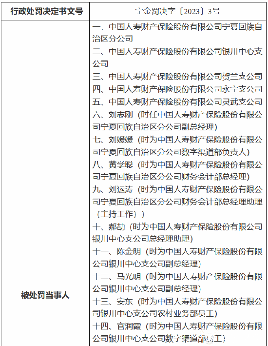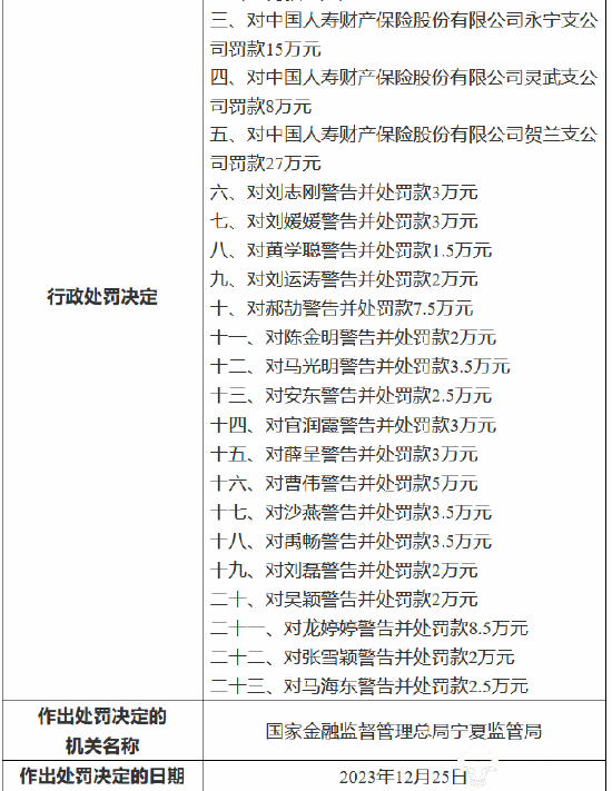 不过半年后,2023年12月25日,宁夏监管局披露行政处罚决定书(宁金罚决字〔2023〕27号),国寿财险宁夏回族自治区分公司、银川中心支公司、贺兰支公司、永宁支公司、灵武支公司存在编制虚假资料、给予投保人保险合同约定以外利益、利用保险代理人以虚构保险中介业务方式套取费用的三宗违法违规行为,分别被宁夏监管局罚款25万元、39万元、15万元、8万元、27万元,合计罚款114万元。