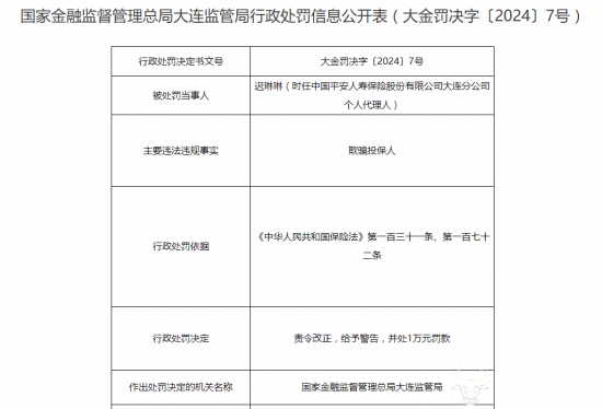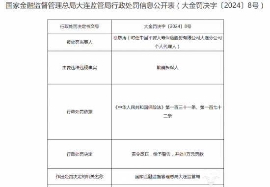 今年1月31日,时任平安人寿保险股份有限公司大连分公司个人代理人迟琳琳、徐敬涛,皆因欺骗投保人,被大连监管局责令改正,给予警告并罚款1万元。