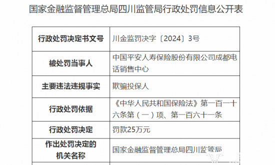 接着不到一个月后,今年1月19日,平安人寿保险股份有限公司成都电话销售中心同样因欺骗投保人被四川监管局罚款25万元。时任平安成都电销中心销售副总经理杨麒、副总经理刘志保作为相关责任人,分别被警告并罚款8万元、5万元。