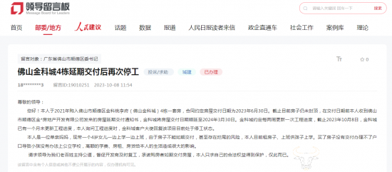 在人民网的“领导留言板”处,有业主向广东省佛山市顺德区委书记留言,其购买的金科桃李府约定房屋交付日期为2023年6月30日,但截至10月8日,房子仍未封顶,在交付日期前,她收到公司发来的房屋延期交付通知书,金科城将日期顺延至2024年3月30日。
