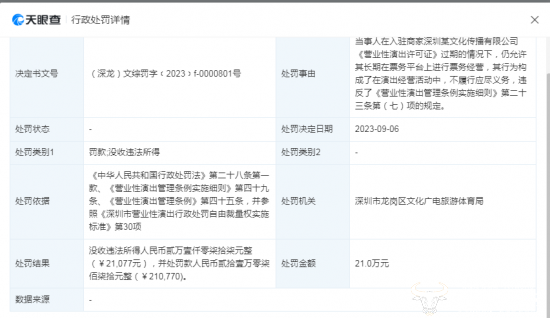 因此,深圳市龙岗区文化广电旅游体育局对其没收违法所得2.1万余元,并处罚款21万多,总计罚没超23万元。