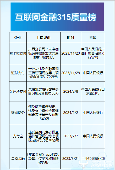 近日,运营商财经网总结了过去一年互联网领域的侵犯消费者权益的经典案例,其中,金融支付领域的案例颇多,金运通支付因未按规定履行客户身份识别义务被罚50万元上榜。