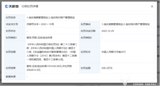 值得注意的是,运营商财经网从天眼查了解到,早在2022年末,金运通支付就因违反清算管理规定、违反特约商户管理规定被中国人民银行济南分行警告,没收违法所得约119.12万元,处以罚款约208.4万元,董事长王树斌当时也被警告罚款。
