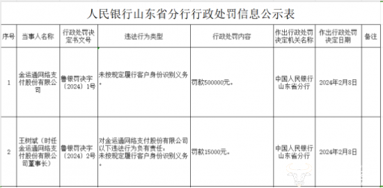 根据中国人民银行山东省分行公布的行政处罚,2024年2月8日,金运通网络支付股份有限公司因未按规定履行客户身份识别义务,被中国人民银行山东省分行罚款50万元。而在同时公布的鲁银罚决字〔2024〕2号中,时任金运通网络支付股份有限公司董事长的王树斌因对公司相关违法行为负有责任,被罚款1.5万元。