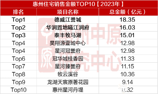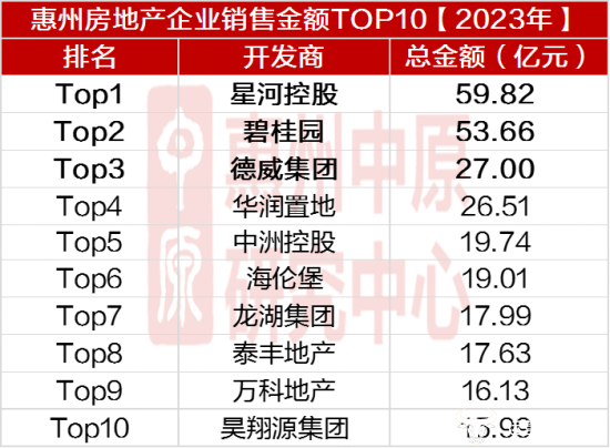 据中原数据发布的《惠州房地产企业销售金额TOP10》显示,2023年全年,德威集团的销售总金额达到27亿元,排名第三。