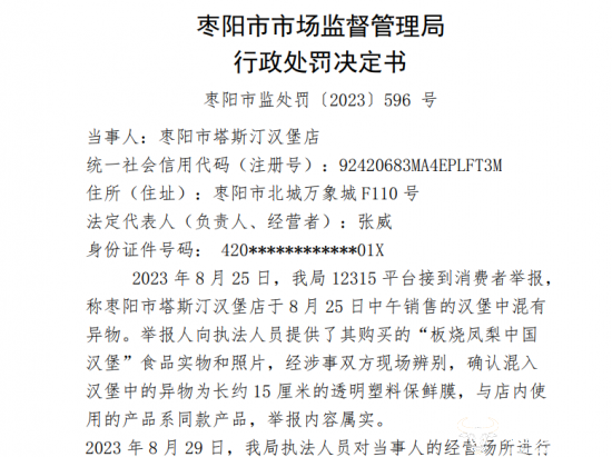 据枣阳市市场监督管理局发布的行政处罚显示,在2023年8月25日,监管局 12315 平台接到消费者举报,称枣阳市塔斯汀汉堡店于 8 月 25 日中午销售的汉堡中混有异物。举报人向执法人员提供了其购买的“板烧凤梨中国汉堡”食品实物和照片,经涉事双方现场辨别,确认混入汉堡中的异物为长约 15 厘米的透明塑料保鲜膜,与店内使用的产品系同款产品,举报内容属实。