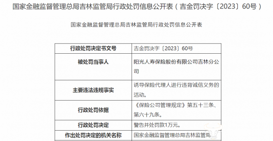 今年1月4日,金融监督管理总局吉林监管局发布了一则行政处罚信息公开表(吉金罚决字〔2023〕60号),文件显示,因存在诱导保险代理人进行违背诚信义务的活动等违法违规行为,阳光人寿保险股份有限公司吉林分公司被吉林监管局警告并罚款1万元。