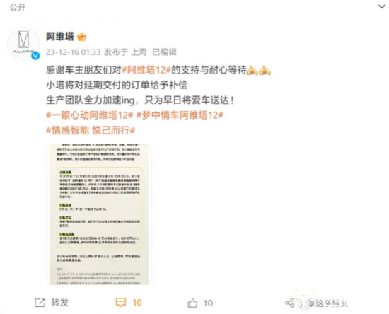 2023年12月16日,阿维塔官方账号宣布阿维塔12延期交付,将对延期交付的订单给予补偿。