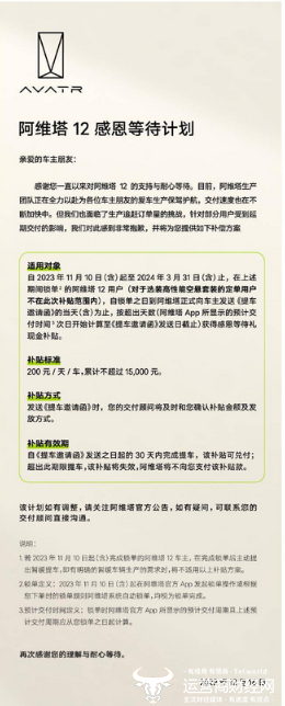 对于延期交付问题,阿维塔方面提供的补偿方案是:自2023年11月10日(含)起至2024年3月31日(含)止,在上述期间锁单的阿维塔12用户,自锁单之日到阿维塔正式向车主发送《提车邀请函》的当天(含)为止,按超出天数获得感恩等待现金补贴。补贴标准为:每车每天200元,累计不超过15000元。