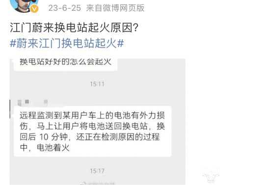 有汽车博主发文:江门蔚来换电站起火原因?同时披露一则截图,内容显示:远程监测到某用户车上的电池有外力损伤,马上让用户将电池送回换电站,换回后10分钟,还正在检测原因的过程中,电池着火。