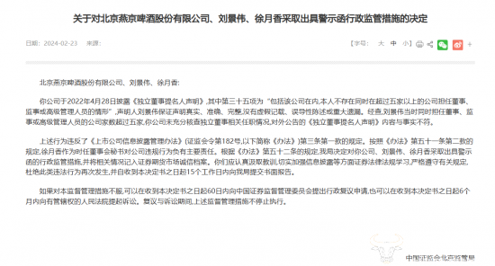 2月23日,中国证监会北京监管局发布了一则《关于对北京燕京啤酒股份有限公司、刘景伟、徐月香采取出具警示函行政监管措施的决定》。