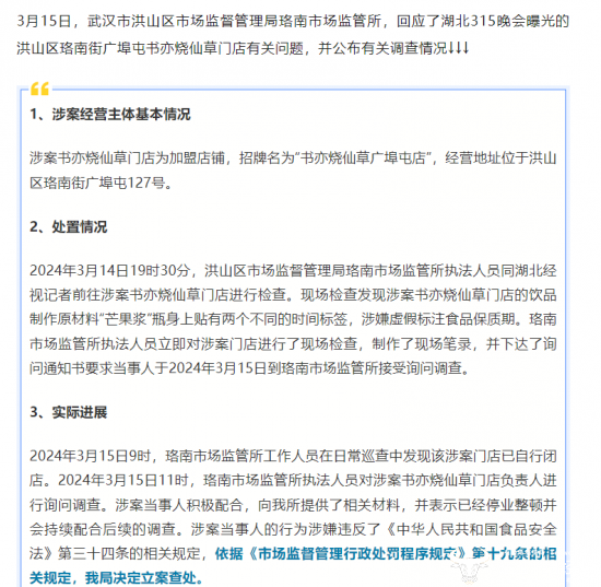 此外,在“湖北视经”官方微信公众号上还显示,武汉市洪山区市场监督管理局珞南市场监管所的执法人员对涉案书亦烧仙草门店负责人进行询问调查。