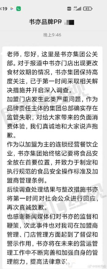 对此,有文章和截图显示书亦烧仙草相关负责人对相关媒体表示,对于门店出现更改食材效期的情况,集团总部确实存在监管失职和工作疏漏,“对给大家带来的负面消费体验,我们真诚地和大家说声抱歉”。其还表示,后续调查处理结果与整改措施书亦将第一时间对社会公众进行回应。但运营商财经目前还并未看到品牌官方的声明。