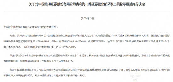 值得一提的是,今年3月7日,中国银河证券青岛海口路证券营业部因使用未在中国证券业协会注册登记的劳务派遣人员为客户办理融资融券开户有关业务,并使用营业部有关印章,通知客户追加融资担保物及用章登记等环节违反公司内部制度,反映出该营业部内部控制不完善,合规管理不到位,被青岛证监局出具警示函。