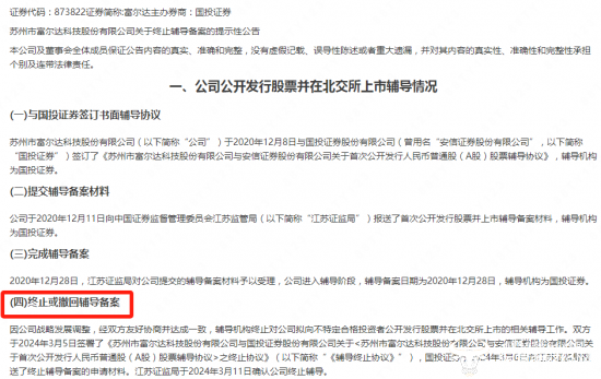 具体来看,3月12日,国投证券保荐项目公司富尔达发布公告称,国投证券于2024年3月6日向江苏证监局报送了终止辅导备案的申请材料,江苏证监局于2024年3月11日确认公司终止辅导。