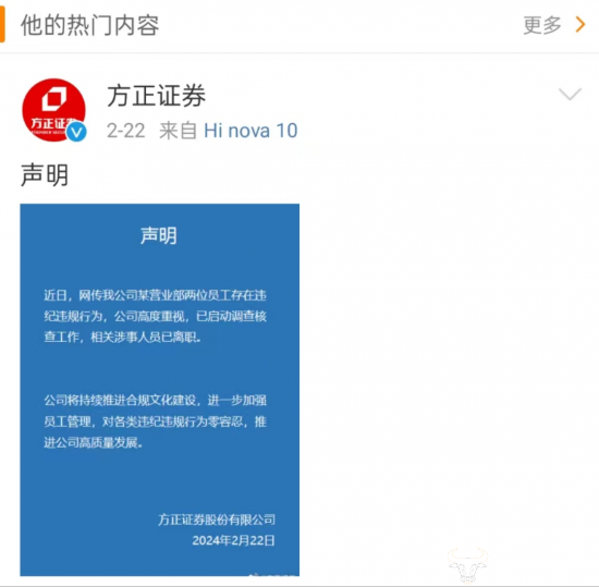 事情被曝光发酵后,方正证券也很快做出了回应,仅仅相隔一天,2月22日,方正证券官方发布声明回应称:近日,网传我公司某营业部两位员工存在违纪违规行为,公司高度重视,已启动调查核查工作,相关涉事人员已离职。