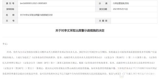 但值得注意的是,这已经不是方正证券第一次被爆出员工侵害客户权益。早在去年6月15日,方正证券郴州永兴大桥路营业部证券从业人员李丈,被查出在2022年5月至2022年11月任职长达半年的时间里,存在将通过公司系统查询获悉的投资者李某账户信息泄露给他人的违法违规行为,被湖南证监局出具警示函。