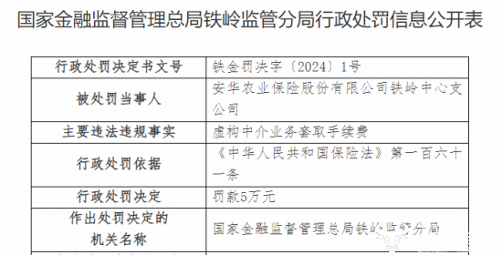 具体来看,今年1月8日,金融监督管理总局铁岭监管分局公布一则行政处罚信息公开表(铁金罚决字〔2024〕1号),直指安华农业保险股份有限公司铁岭中心支公司存在虚构中介业务套取手续费的违法违规行为,铁岭监管分局最终对安华农险铁岭中支罚款5万元。