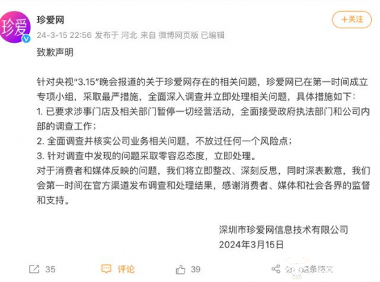 被315曝光后的珍爱网,迅速在当晚发布致歉声明,但声明中的“已要求涉事门店及相关部门暂停一切经营活动”再次将舆论加深。难道只有曝光的门店有问题,其他门店就没事儿吗?这种像是“应付式”的声明似乎说明珍爱网并未“真心道歉”。