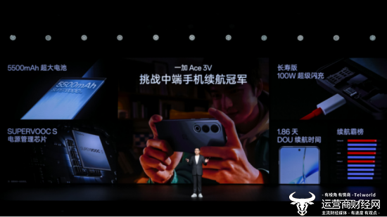 一加 Ace 3V 在续航、屏幕、影像等方面同样带来了旗舰体验的普及。一加 Ace 3V 首次为 5500mAh 大电池 + 100W 长寿版超级闪充的续航组合引入 AI 续航管理技术,基于 SUPERVOOC S 电源管理芯片,将 AI 续航模型深度写入系统底层,实现全局电力合理规划。配合超大电池以及第三代骁龙 7+ 处理器的出色能效表现,一加 Ace 3V 能够实现超 1.86 天的使用时间。