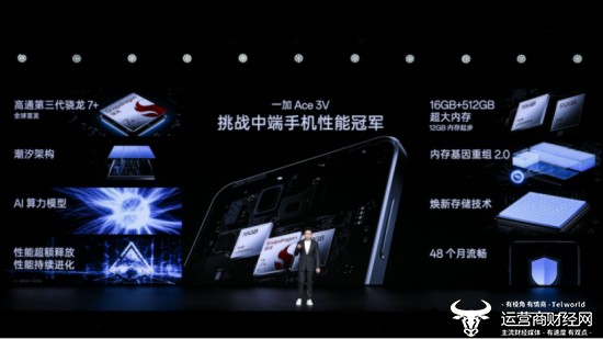 一加 Ace 3V实现了中端手机性能的跨越式升级。它全球首发一加与高通联合定义的最强 7 系处理器——第三代骁龙 7+ 移动平台。第三代骁龙 7+ 移动平台采用最新 8 系旗舰同代架构和制程工艺,做到了「架构相同,性能相近;制程相同,续航超越」。为了让性能超额释放,一加 Ace 3V 还首次搭载自研「潮汐架构」和全新 AI 算力模型, 通过 AI 能力写入 SoC 底层智能分配算力资源,彻底榨干第三代骁龙 7+ 移动平台的澎湃动力,帮助一加 Ace 3V 实现高性能与低功耗的平衡共融。