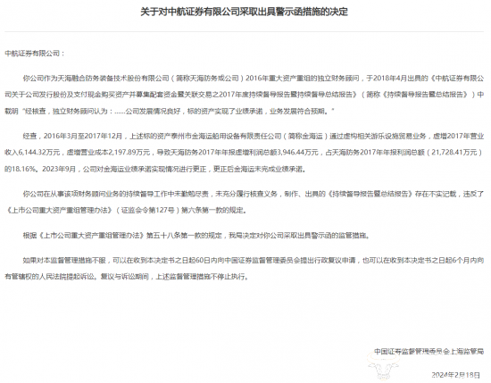 具体来看,2月18日,中航证券被查出,作为天海融合防务装备技术股份有限公司2016年重大资产重组的独立财务顾问,于2018年4月出具的《持续督导报告暨总结报告》中载明“经核查,独立财务顾问认为:……公司发展情况良好,标的资产实现了业绩承诺,业务发展符合预期。”