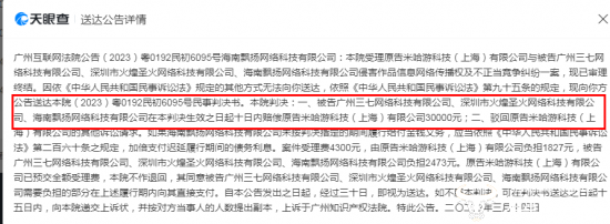 今年3月14日,广州互联网法院送达一审判决公告,判决三七互娱等向米哈游赔偿3万元。目前,二审结果还没出来。