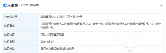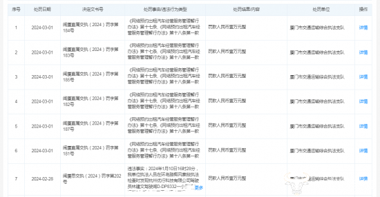 此外,运营商财经网发现,曹操出行大都是在同一天收取多张罚单,例如在3月1日就被厦门市交通运输综合执法支队罚了6次。就其中之一的行政处罚决定书“闽厦直属交执(2024)罚字第184号”显示,曹操出行因违反《网络预约出租汽车经营服务管理暂行办法》第十七条,《网络预约出租汽车经营服务管理暂行办法》第十八条第一款,被厦门市交通运输综合执法支队罚款1万元。