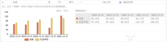 值得一提的是,刘涛在2022年的薪酬是126.8万,而2021年只有44.17万,一年内大幅涨薪82.63万,目前在公司高管内薪酬最高,其次是副总王爱国99.08万。