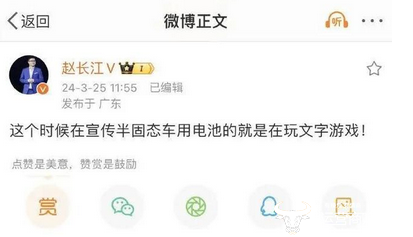 尽管该文并没有直接表明是对智己汽车喊话,但是从时间上看,智己汽车联席CEO刘涛刚宣传完固态电池,赵长江就发出了这样一句话,因此广大网友推测赵长江意在炮轰刘涛的言论。
