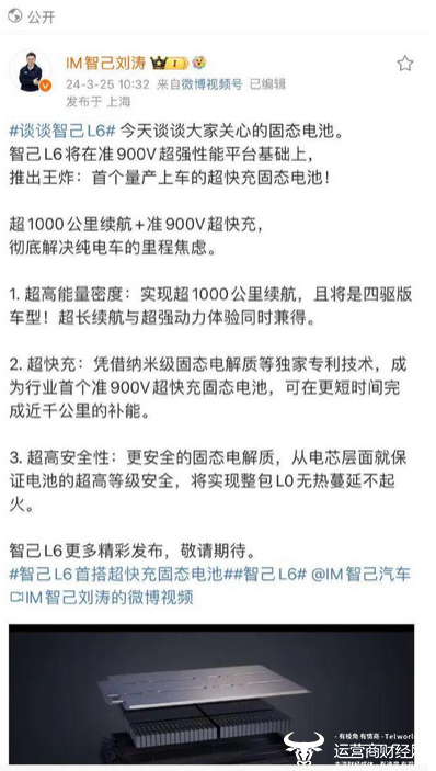 2024年3月25日,智己汽车联席CEO刘涛在公开社媒平台表示:智己L6是首个量产上车的超快充固态电池! 并从超高能量密度、超快充、超高安全性三个方面宣传自家新车。