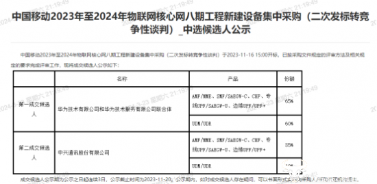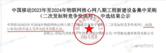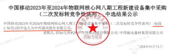 2024年3月21日,中国移动采购官网发布中国移动2023年至2024年物联网核心网八期工程新建设备集中采购(二次发标转竞争性谈判)的中选结果,根据公示,标段1/标包1的中选人为中兴通讯。