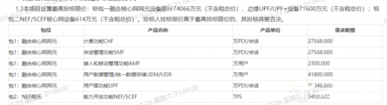 先来了解一下这个项目,采购内容主要就是融合核心网设备和NEF/SCEF核心网设备,标包一中核心网网元设备部分最高限价74066万元,边缘UPF/UPF+设备最高限价71600万元;标包二最高限价614万元,合计预算超过14亿元。