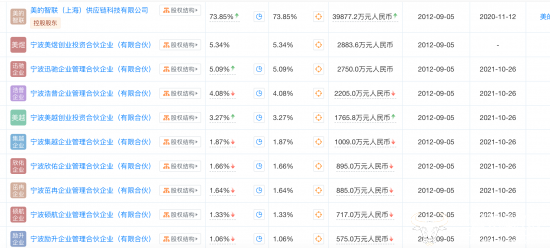 以安得智联为例,根据天眼查提供的信息,这家公司的最大股东是由美的集团100%控股的子公司美的智联,控股73.85%,而其他的股权分别由十家小的合伙企业控制。