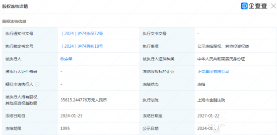 正荣集团的创始人为欧宗荣,如今公司业绩亏损,债务违约,他的处境想必也不轻松。据企查查APP显示,今年1月,他作为被执行人,被冻结股权3.5615亿元。