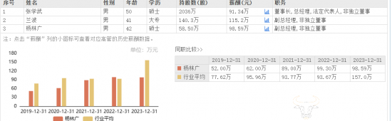 但副总杨林广却是降薪了,在去年他的薪酬为98.59万元,相比2022年他降薪了0.71万元,虽然不多,但就他一人降薪,这是为何?其中缘由不得而知。