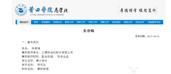 值得一提的是,2017年他还担任过莆田学院商学院的兼职教授。公开信息显示,21年莆田学院商学院与三棵树集团曾进行过校企合作,并依托学院力量为三棵树集团营销骨干人员开办了成人教学班。