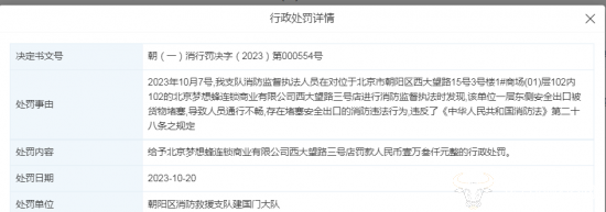 2023年10月20日,北京梦想蜂连锁商业有限公司西大望路三号店一层东侧安全出口被货物堵塞,导致人员通行不畅,存在堵塞安全出口的消防违法行为,被朝阳区消防救援支队建国门大队罚款1.3万元……
