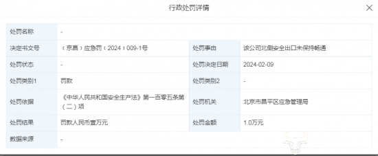 据北京市昌平区应急管理局下发的行政处罚决定书“〔京昌〕应急罚〔2024〕009-1号”显示,便利蜂的运营主体公司北京梦想蜂连锁商业有限公司立水桥西路一分店,因北侧安全出口未保持畅通,违反了安全生产法。因此,北京市昌平区应急管理局于2月9日对其处以了罚款1万元的行政处罚。