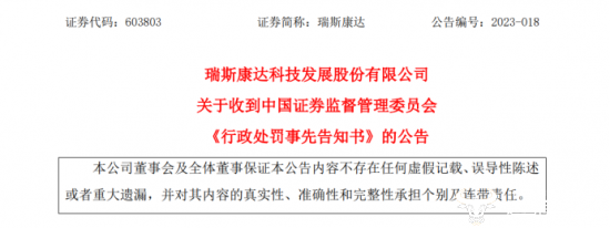 2023年6月,证监会下发了一条关于瑞斯康达的行政处罚书,其中说明,从2018年开始,瑞斯康达旗下子公司深蓝迅通开展了一项没有实质的虚假自循环业务,导致瑞斯康达披露的2019、2020年报存在虚假记载。