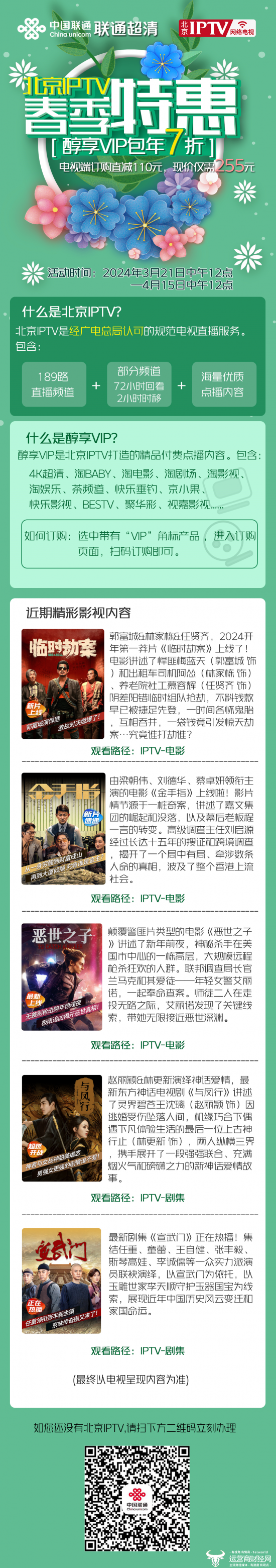 北京IPTV春季特惠,在家也能享受高清精彩影视!IPTV-电影、IPTV-剧集,多部精彩大片任您选!